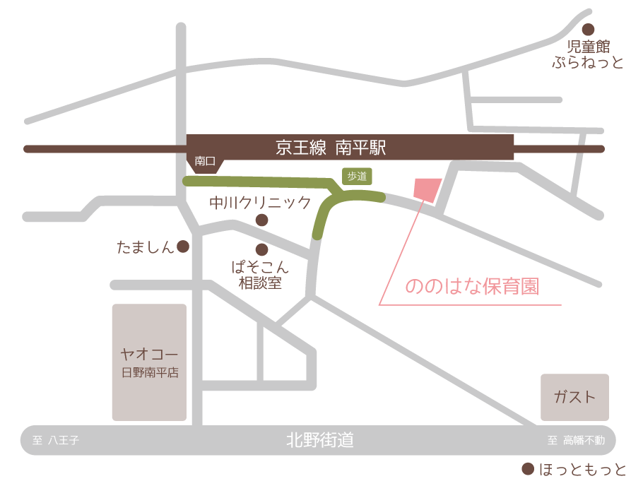 ※車では南平駅南口方面からは入れません。たましん・ヤオコー、北野街道のガスト横の道からは園の方には進入できませんのでご注意下さい。